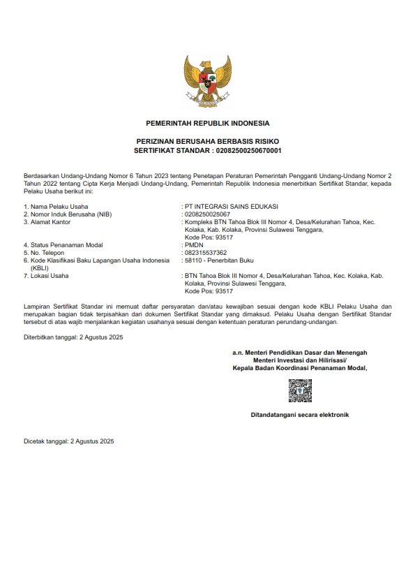 Gambar di samping merupakan Sertifikat Standar Perizinan Berusaha Berbasis Risiko dengan nomor 02082502052670001, yang diterbitkan oleh Pemerintah Republik Indonesia kepada PT Integrasi Sains Edukasi. Sertifikat ini diberikan sebagai bentuk legalitas usaha dalam bidang Penerbitan Buku (KBLI 58110) sesuai dengan ketentuan peraturan perundang-undangan berdasarkan Undang-Undang Nomor 6 Tahun 2023 dan Undang-Undang Nomor 2 Tahun 2022 tentang Cipta Kerja.