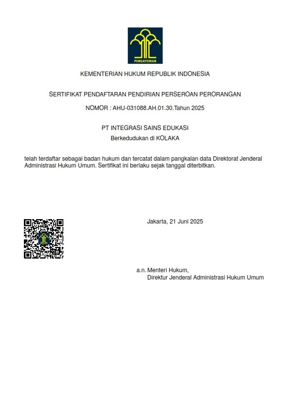 Gambar di samping merupakan Sertifikat Pendaftaran Perusahaan Perseorangan atas nama PT Integrasi Sains Edukasi, yang telah resmi terdaftar dalam basis data Direktorat Jenderal Administrasi Hukum Umum (AHU) Kementerian Hukum dan Hak Asasi Manusia Republik Indonesia. Sertifikat ini diterbitkan pada tanggal 21 Juni 2025 sebagai bukti legalitas dan pengesahan status badan hukum yang sah dan diakui oleh negara.